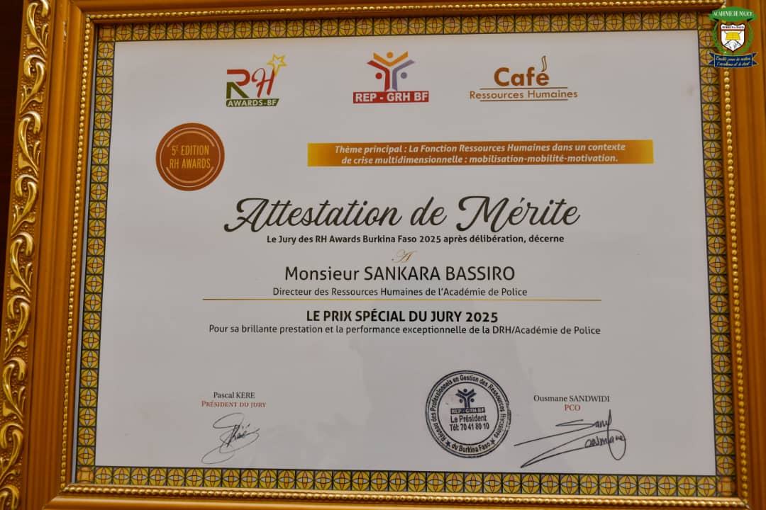 À l'occasion de la 9α΅ édition duCafé-RH (Ressources Humaines) et de la 5α΅ édition des RH Awards, organisées par le Réseau des Professionnels en Gestion des Ressources Humaines (REP/GRH) en partenariat avec le ministère de la Fonction publique, du Travail et de la Protection sociale, nous avons le plaisir de vous annoncer une nouvelle qui honore l’Académie de police.